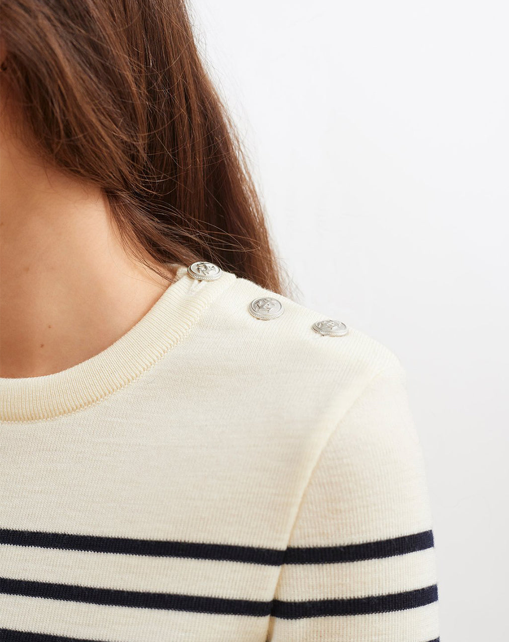 De rondgebreide halslijn en de karakteristieke knoopsluiting op de schouder geven de Marée een subtiele maritieme touch. Dankzij het 1x1 ribbreisel voelt de trui comfortabel aan en blijft hij mooi in vorm, terwijl de hoogwaardige wol zorgt voor een ademend en warm draagcomfort.