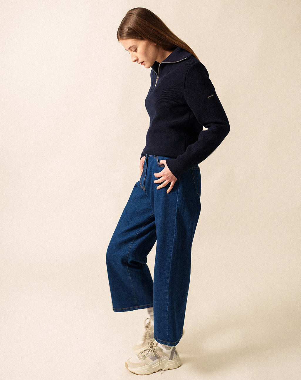 De halve ritskraag en de parelsteekstructuur geven het ontwerp een stoer en tijdloos karakter. Subtiele details op de mouwen en het lichaam zorgen voor extra diepte en een moderne twist.