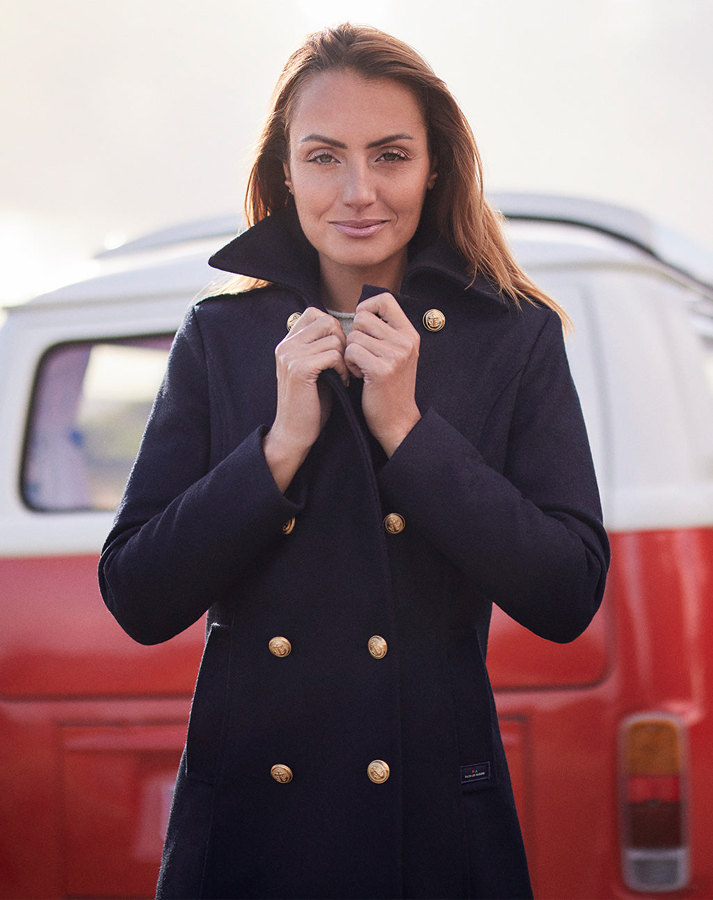 Met zijn dubbele rij glanzende, gouden messing knopen met ankerdetails en klassieke overslagsluiting, straalt deze jas tijdloze klasse uit. De jas is gevoerd met zachte polyester voor extra draagcomfort.