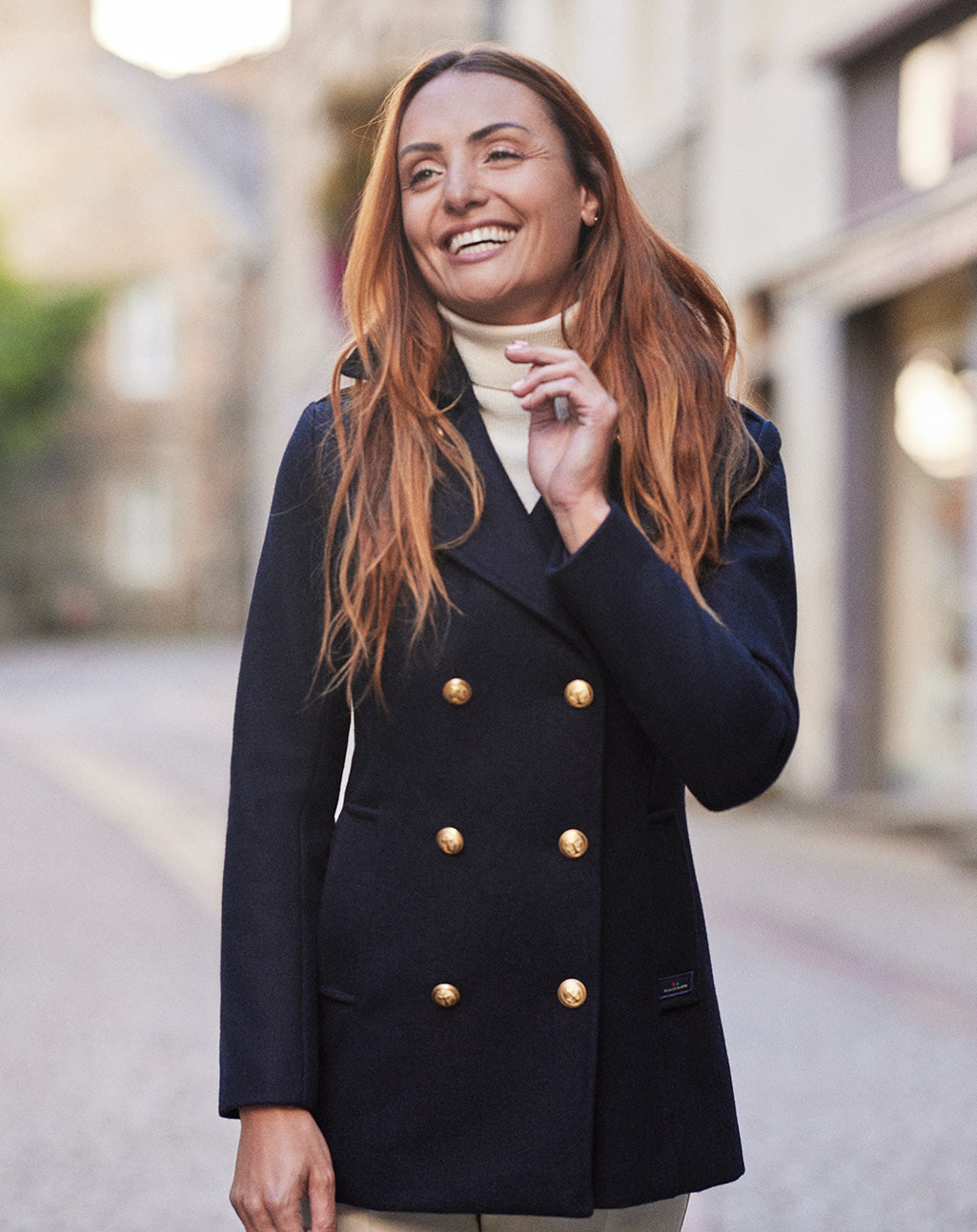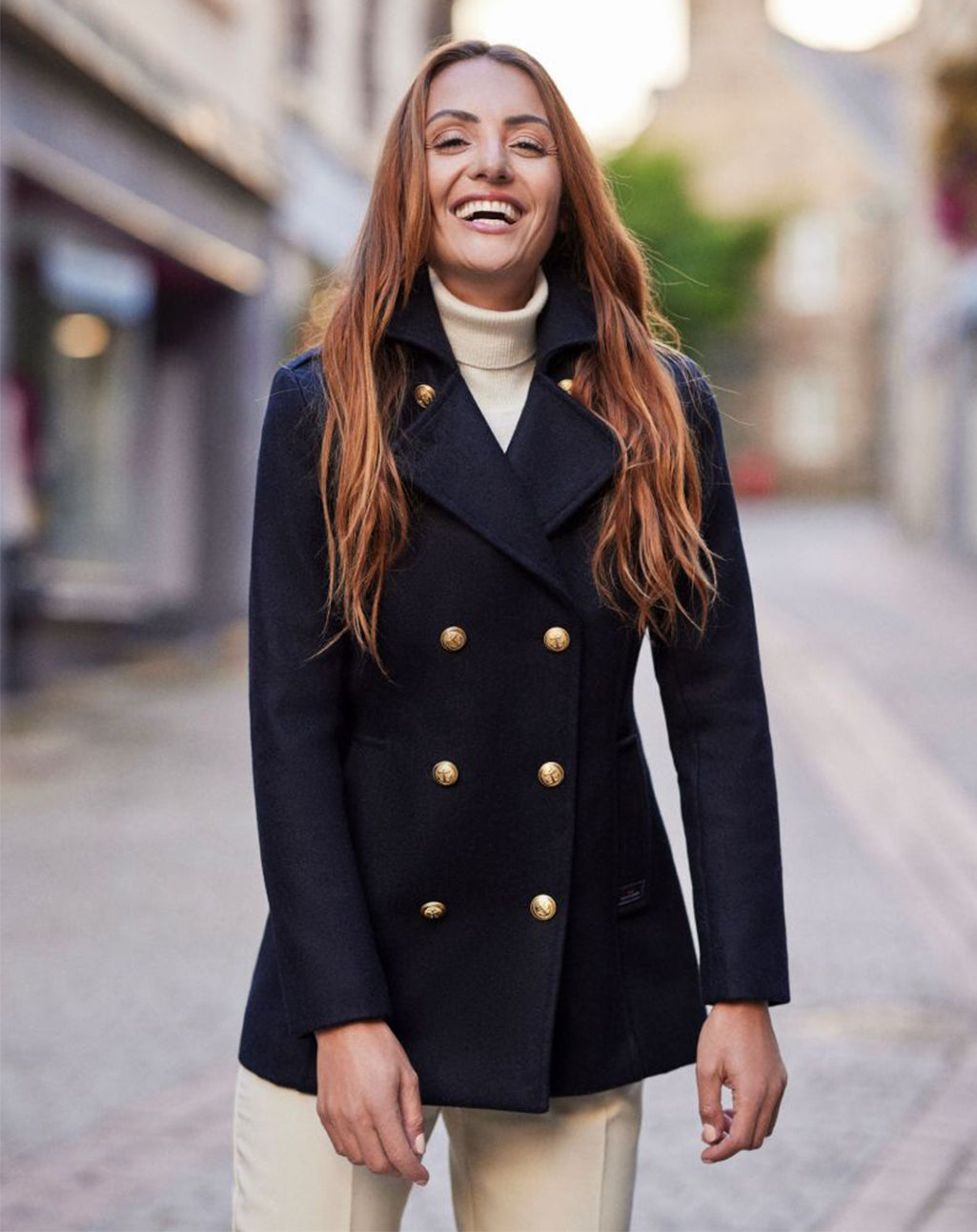 De Detroit van Dalmard Marine is een iconische damescaban die maritieme elegantie en vrouwelijke finesse moeiteloos combineert. Deze prachtig getailleerde jas is gemaakt van 100% waterdichte wol, geproduceerd in Frankrijk door een erkend ambachtelijk atelier (Entreprise du Patrimoine Vivant). Hierdoor biedt de jas niet alleen een luxe uitstraling, maar ook duurzaamheid en bescherming tegen de elementen.