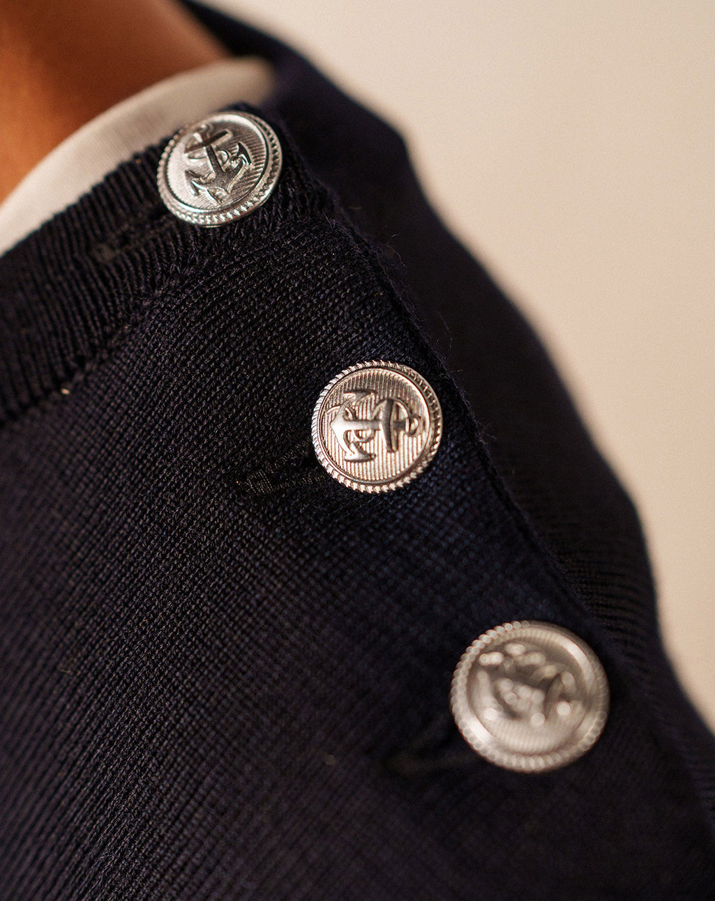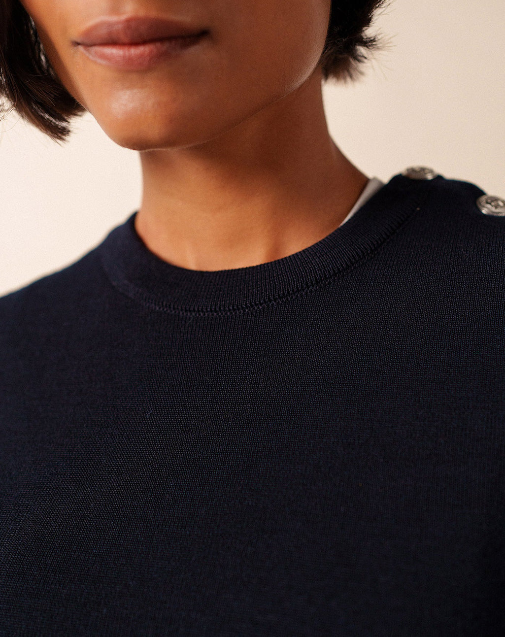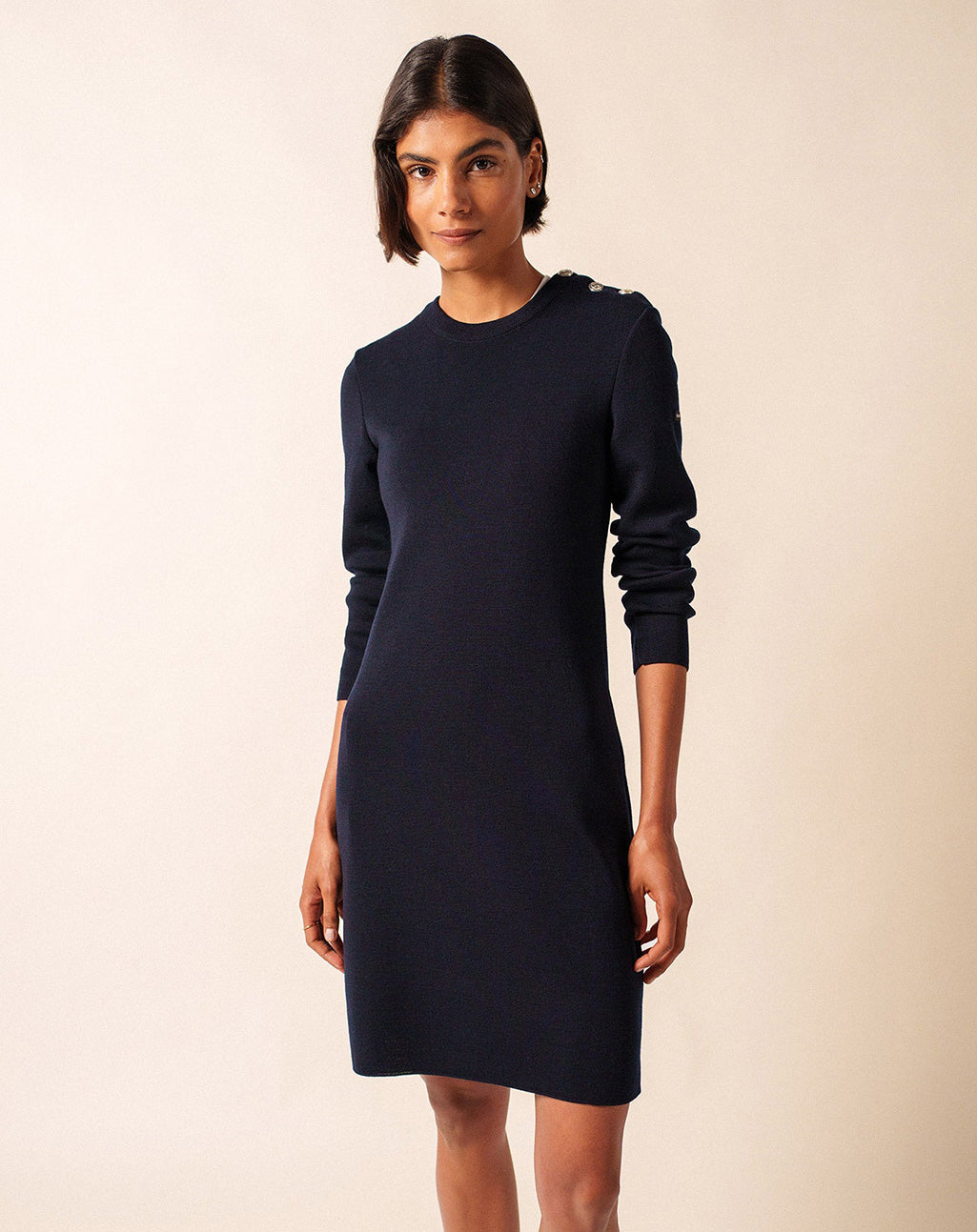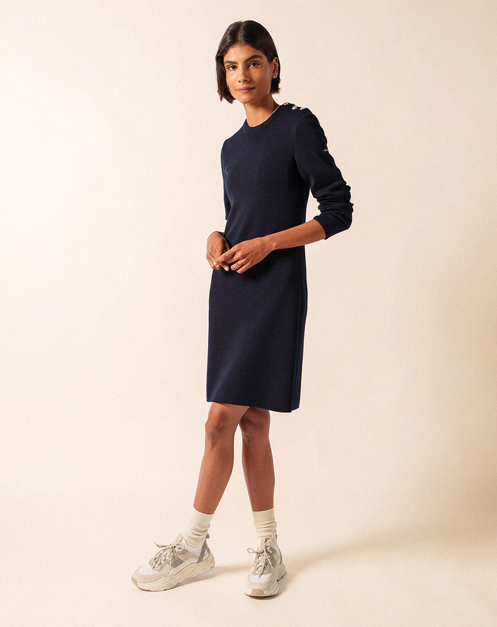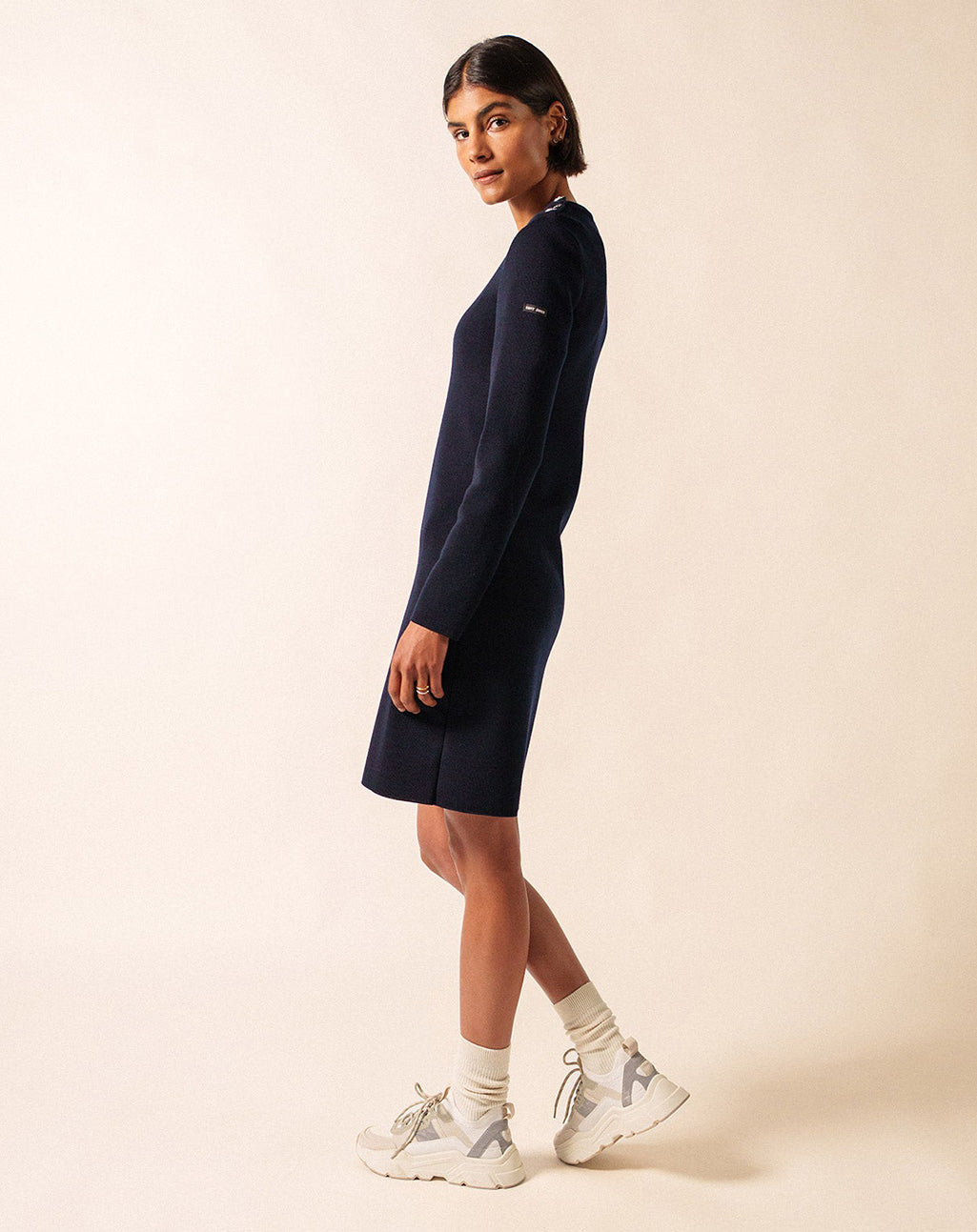 Met een slanke, aansluitende pasvorm en een ronde hals straalt deze jurk eenvoud en klasse uit. De zilveren knoopsluiting op de linkerschouder, kenmerkend voor de Saint James marine-stijl, voegt een subtiele, maritieme touch toe. De lange mouwen en het 1x1 ribbreisel zorgen voor een flatterende en comfortabele pasvorm.