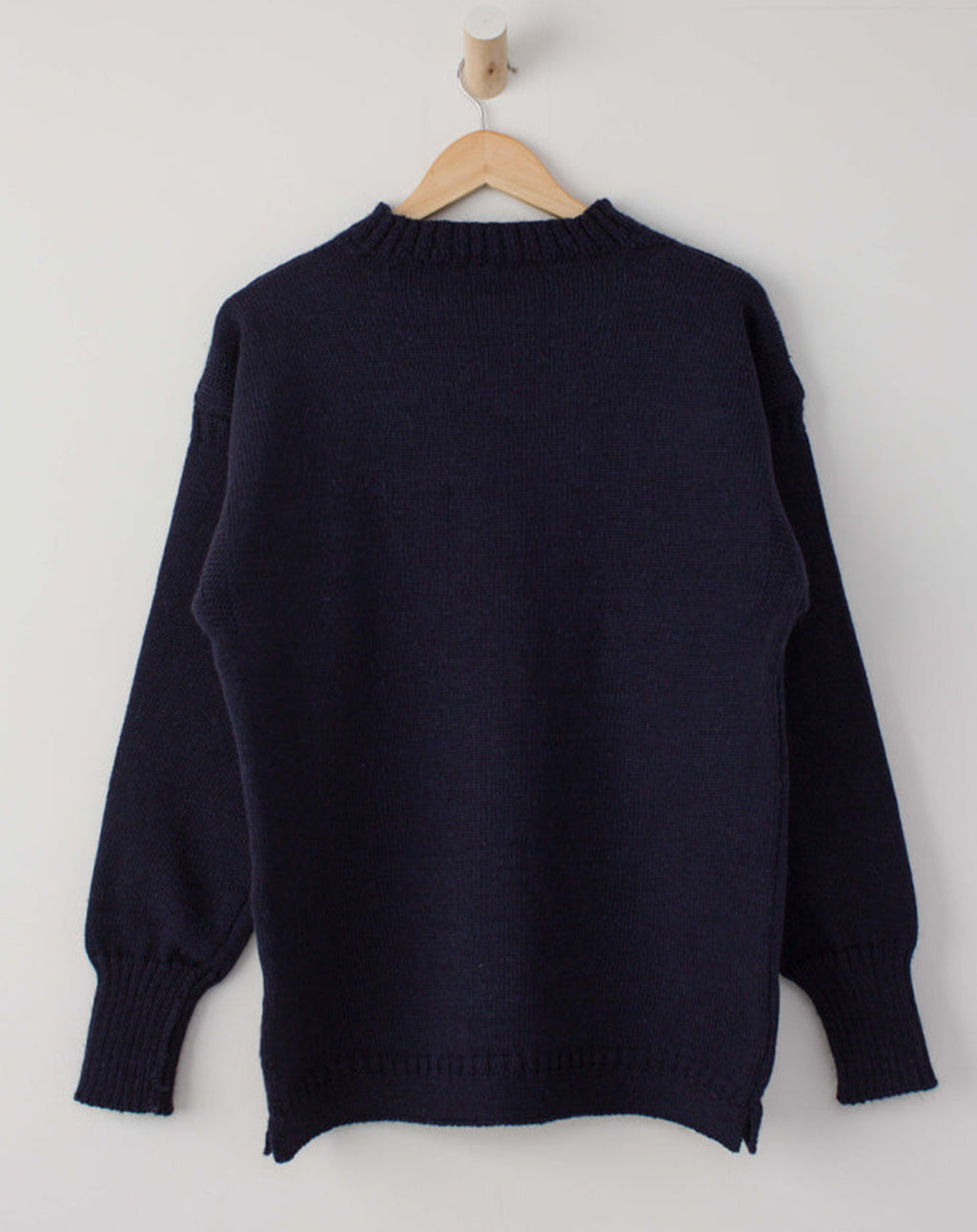 - Traditioneel Guernsey breisel, met ribdetails op de schouders en splitten in de zijnaden.