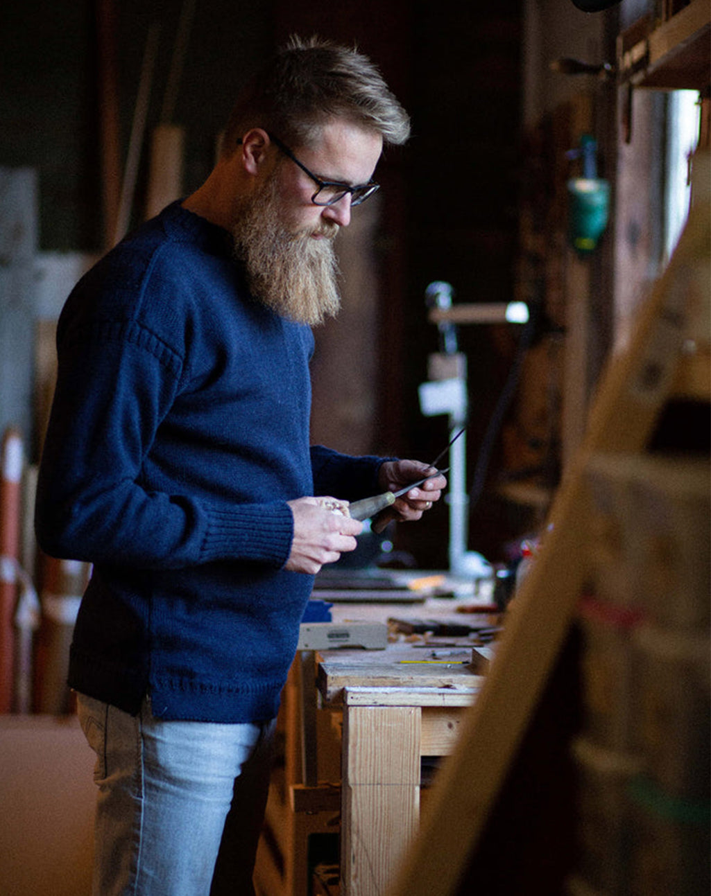 De Guernsey trui is volledig symmetrisch en omkeerbaar, waardoor hij zowel voor als achter gedragen kan worden. Elk stuk wordt met de hand afgewerkt door lokale breiers op Guernsey, waardoor de ambachtelijke kwaliteit gewaarborgd blijft.