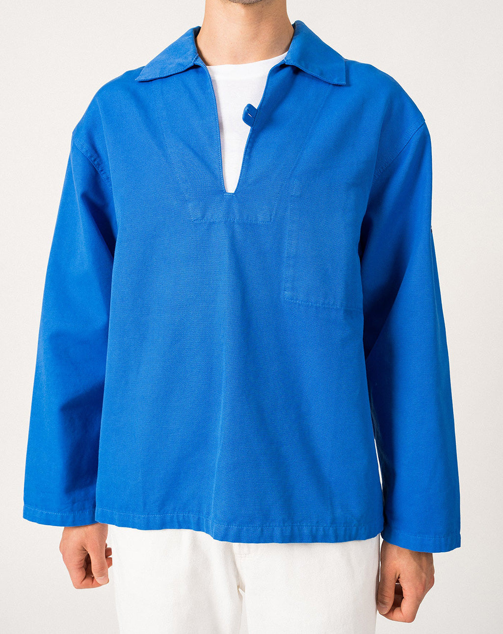 De Nemo is een traditionele Bretonse visserskiel, ooit gemaakt van restjes zeildoek en nu vervaardigd uit dik en stevig katoen dat bestand is tegen weer, wind en zwaar werk. Deze authentieke kiel heeft een rechte pasvorm, een splitkraag met knoopsluiting en een verborgen binnenzak met knoopje – praktisch ontworpen om niet te blijven haken in de netten.