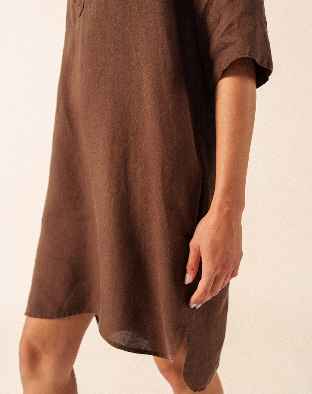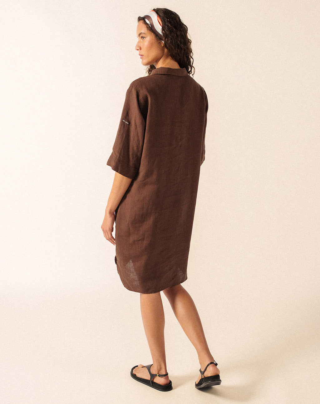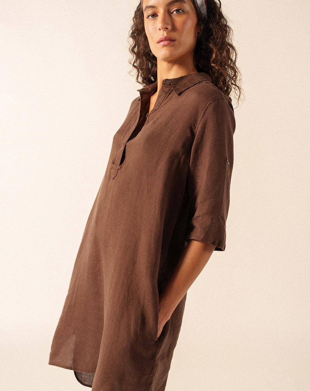 Geïnspireerd door het klassieke poloshirt, combineert de Léonie een sportieve kraag met een verfijnd vrouwelijk silhouet. De rechte snit en de splitten aan de zijkant zorgen voor maximale bewegingsvrijheid, terwijl de discreet geïntegreerde steekzakken in de zijnaden praktisch nut toevoegen zonder de strakke lijn van de jurk te verstoren.