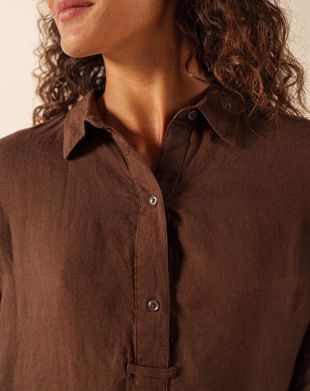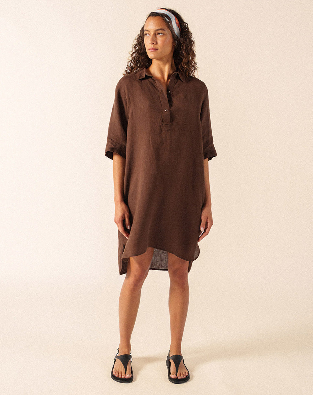 De Léonie dress van Saint James is ontworpen voor dagen waarop de zon je uitnodigt om het tempo te vertragen. Deze jurk is vervaardigd van 100% lichtgewicht linnen, een natuurlijke stof die heerlijk koel aanvoelt op de huid en optimaal ademt tijdens warme zomerdagen.